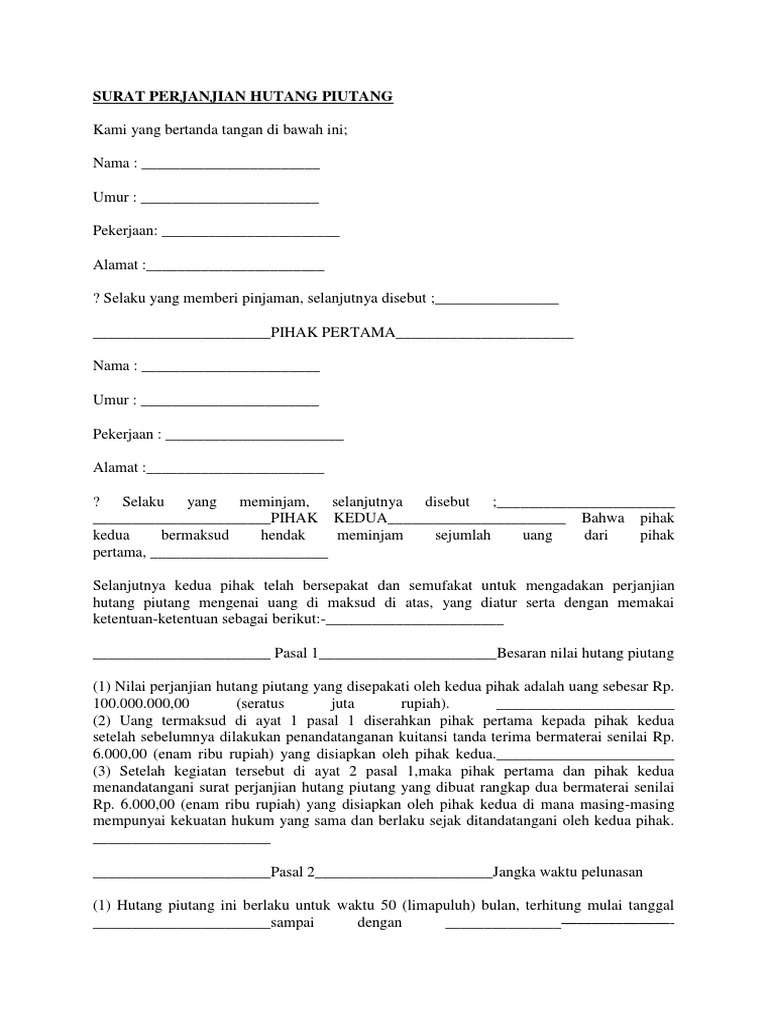 Nah dalam hal ini kamu cukup menggunakan matrai 6000 dan surat pernyataan pelunasan hutang. Contoh surat pernyataan pelunasan hutang bermaterai. Pastikan orang tersebut punya kartu identitas. Surat perjanjian hutang piutang tanpa jaminan. Contoh surat pernyataan pelunasan hutang pribadi.